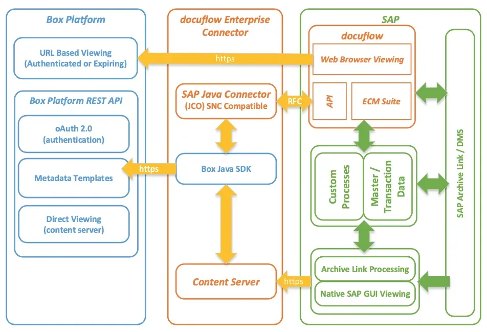 1 outbound storage description outbound storage allows sap users to attach content/documents to objects within sap instead of storing the document into the sap database, docuflow will store the document in your box environment 2\ content server vs ecm when storing outbound documents, there are two options content server ecm server content server content server is a communication specification defined by sap that uses https to communicate with the docuflow middleware docuflow is an sap content server certified application ecm server ecm server is a communication specification based on sap’s rfc socket protocol called jco (java connector) the ecm server unlocks remote function calls and docuflow provides an api within sap to leverage this technology, allowing enhanced functionality over standard content server while we are only discussing outbound communications, ecm with jco does allow for bi directional communication between docuflow and sap, inbound and outbound content server considerations pros https protocol – routes well over the public internet and can be used with stateful packet inspection firewalls does not require docuflow transports to be deployed in sap cons does not inherently allow for custom metadata to be sent during upload to box ecm considerations pros custom metadata can be sent allows for a ‘do anything’ pipeline into sap cons rfc protocol requires non standard ports to be opened 3\ metadata optional business metadata can be set in box using fields in metadata templates this metadata includes any values from sap that go beyond the mandatory system metadata required by docuflow optional business metadata is particularly valuable when you want to allow end users to access sap linked documents directly in the box interface, especially through search enable any box processes that require or benefit from sap business metadata, such as triggering a box relay workflow setting or updating a box shield retention policy allowing other business systems (e g , salesforce) to access or link to documents stored by sap facilitating box governance the method of applying optional business metadata to box depends on the message output approach ecm or content server ecm ecm natively supports setting a box metadata template and its values when creating the document in box in real time or synchronously content server due to the sap specification, content server does not allow optional business metadata to be set during document creation in box instead, this must be done through a docuflow technology called a 'callback' callback call backs utilize the ecm connectivity and update the document metadata once the sap content server store/create operation has been completed this means there are additional api calls/time required to update the document with business metadata optional business metadata considerations pros can enable metadata bases searches and search result filtering for users accessing content within box enables the ability to do inbound rules when using ecm connectivity \[link to the inbound guide document for box] cons content server does not inherently allow for custom metadata to be sent during upload to box this then requires an ecm call to back populate the business metadata which adds additional transaction time and box api calls 4\ dynamic location routing dynamic location routing dynamic location routing is a feature that allows documents to be automatically stored in different box folders based on associated sap data when the document is transferred from sap to box this capability enables organizations to create rules and logic that determine the storage location of documents based on specific sap attributes or metadata by leveraging dynamic location routing, companies can automatically categorize and file documents according to business specific criteria ensure consistent and organized storage of documents across various departments or processes simplify document management and improve information accessibility here are a couple of examples to illustrate how dynamic location routing can be used 5\ custom folders folders are essential in box, as all documents must be stored within them the user account that creates the top level folder becomes the owner of all subfolders and documents beneath it to avoid individual ownership, use a managed user account for creating the top level folder best practices suggest a single user should own fewer than 20 million documents in a box tenant each folder should contain no more than 15,000 documents for large document volumes, consider implementing a folder structure content server for box natively supports folder hashing to manage the 15,000 document limit per folder it has a setting for the maximum number of documents per folder and automatically creates new folders when the threshold is reached custom folder considerations pros ensures the 15,000 document limit per folder in box is managed when using ecm (content server natively creates a folder hash to handle this) enables the implementation of business logic for folders, such as creating a new box folder for each new work order in plant maintenance allows ecm to link folders to sap business objects instead of individual documents, which is useful for scenarios involving large batches of documents that need to be easily linked to sap business objects cons content server's specification does not inherently support the creation of custom folders however, docuflow automatically manages document and folder threshold limits 6\ viewing options when accessing sap content that is stored and linked to box, users have three options for viewing the documents sap viewer the document is downloaded to the user’s computer and the sap viewer will display the document \[sap viewer screenshot] box authenticated url link a box viewing url is returned to the user who must then authenticate to box to view the document the document is viewed in the box web based viewer box short lived (unau